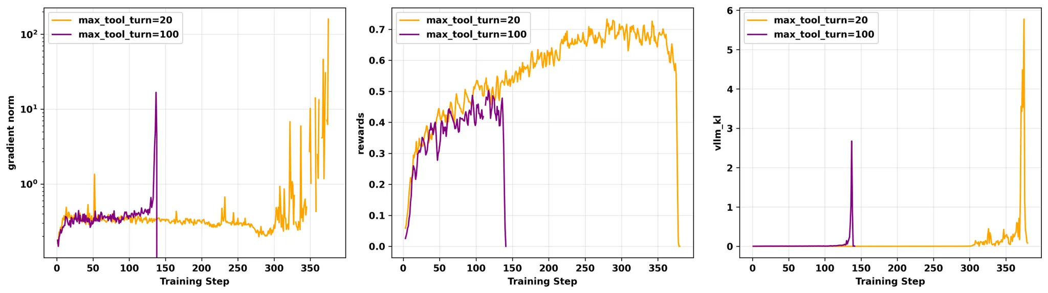 传统的工具调用,工具生成的结果,在训练阶段会被 mask 掉。这样会导致RL过程中,大模型会强制计算2个不想关片段的相关性,但是可能这个相关性在现有大模型的能力里就是没有的。因此训练很容易崩溃。