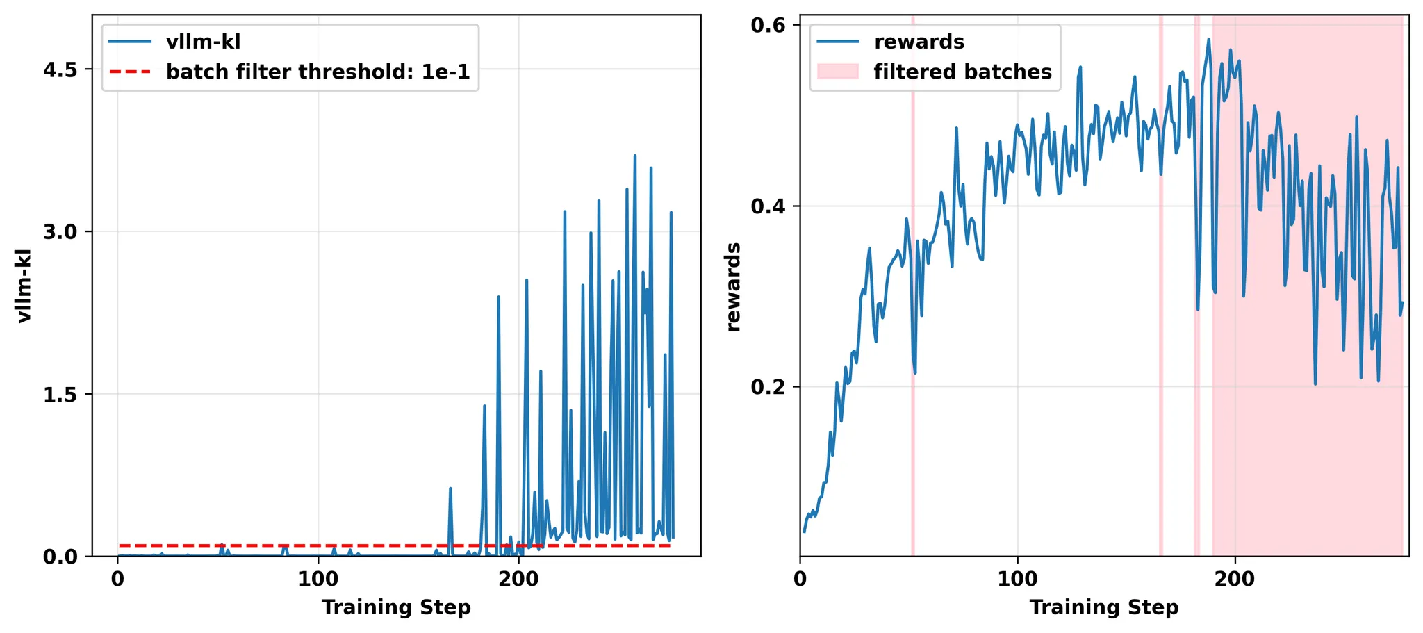 如果vllm-kl > 0.1,过滤掉当前的batch数据,不更新模型权重。
