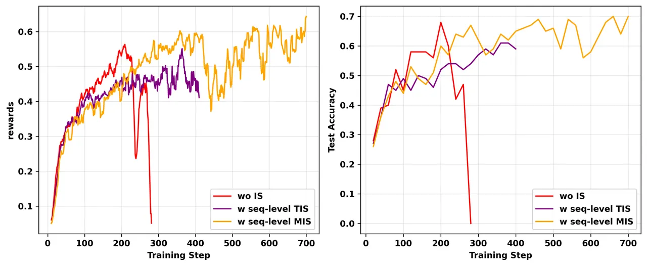 作者提出了 MIS 策略:对于 seq 的重要性误差超过 C 的,直接 masked 掉,不参与梯度更新