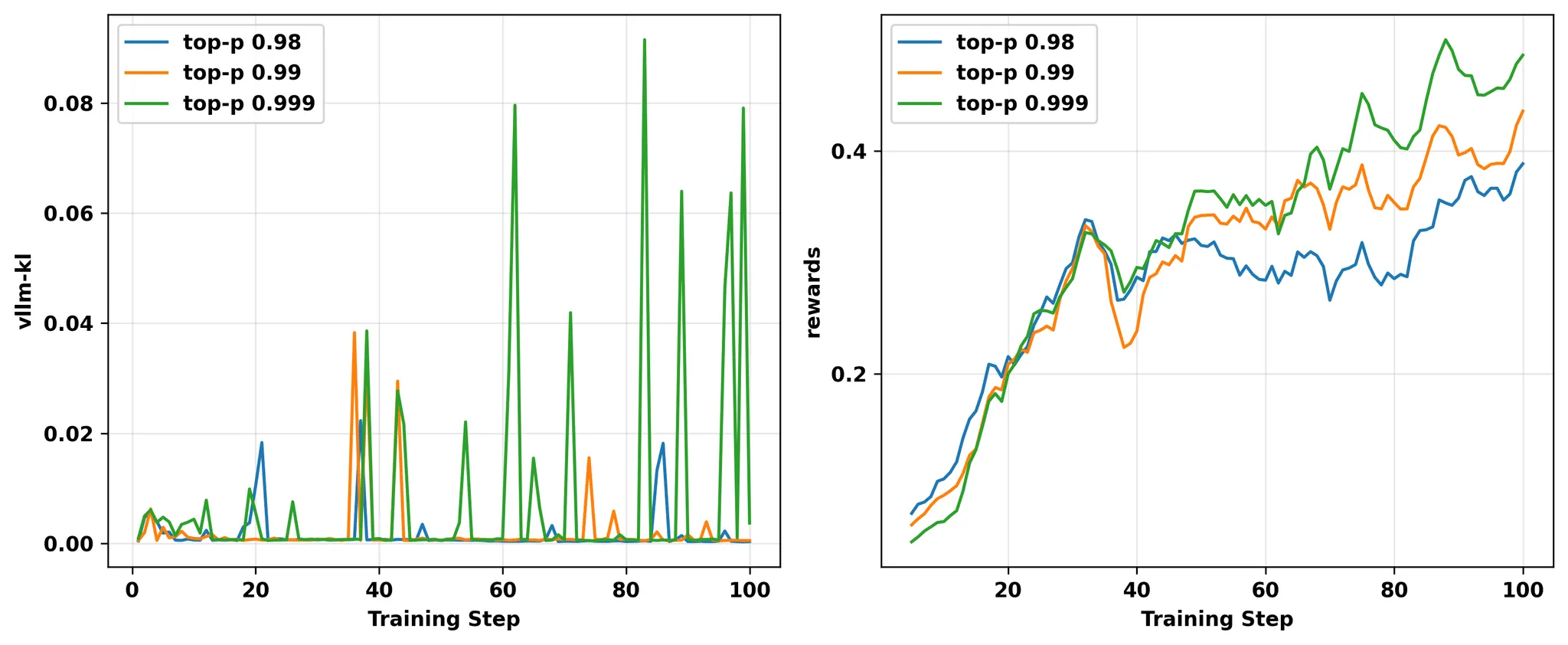 top-p越大,vllm-kl越大,但是 reward 反而更好了。。。